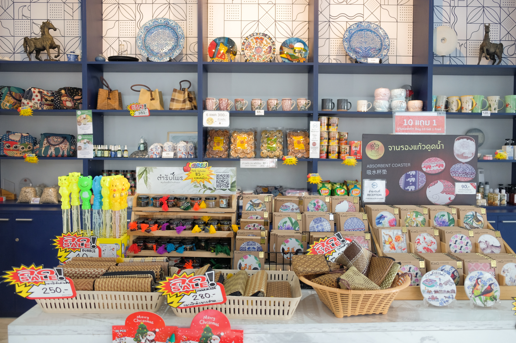 ร้านของฝาก เปิด 24 ชม. ขายของชุมชน ตั้งแต่ ข้าวแต๋น , กระเป๋าสาน , จานรองแก้วเซรามิก
